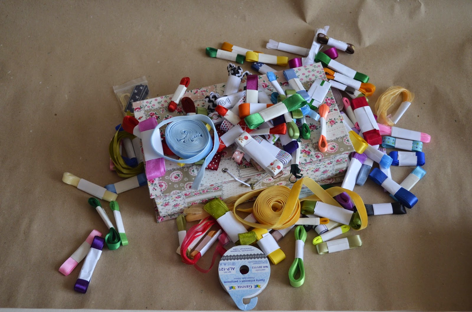 Ленты я покупаю много, но немного :) В смысле цветов и оттенков много, а отрез небольшой - метр, редко два. Для картонажа этого достаточно.