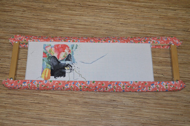 Обычно, большие работы (размер ткани больше 30*30 см) я вышиваю на гобеленовых рамках нужного размера - 45 или 61 см. Я уже раньше хвасталась своими большими пяльцами (на них сейчас тюльпаны вышиваются), у меня еще есть такие же (61 см) с клипсами, вот